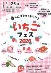 柳川特産のいちご「あまおう」を贅沢に使ったスイーツピザづくり体験(有料)や会場周辺の海岸堤防・干拓地をめぐるウォークラリー(いずれも事前予約が必要)をはじめ、柳川産あまおう、あまおうスムージー、あまおう大福の販売、中村学園大学短期大学部食物栄養学科の皆さんによる学生食堂など「いちごづくし」のイベントです。軽トラ市・キッチンカー、有明海を学ぶ紹介映像の上映会もあります。